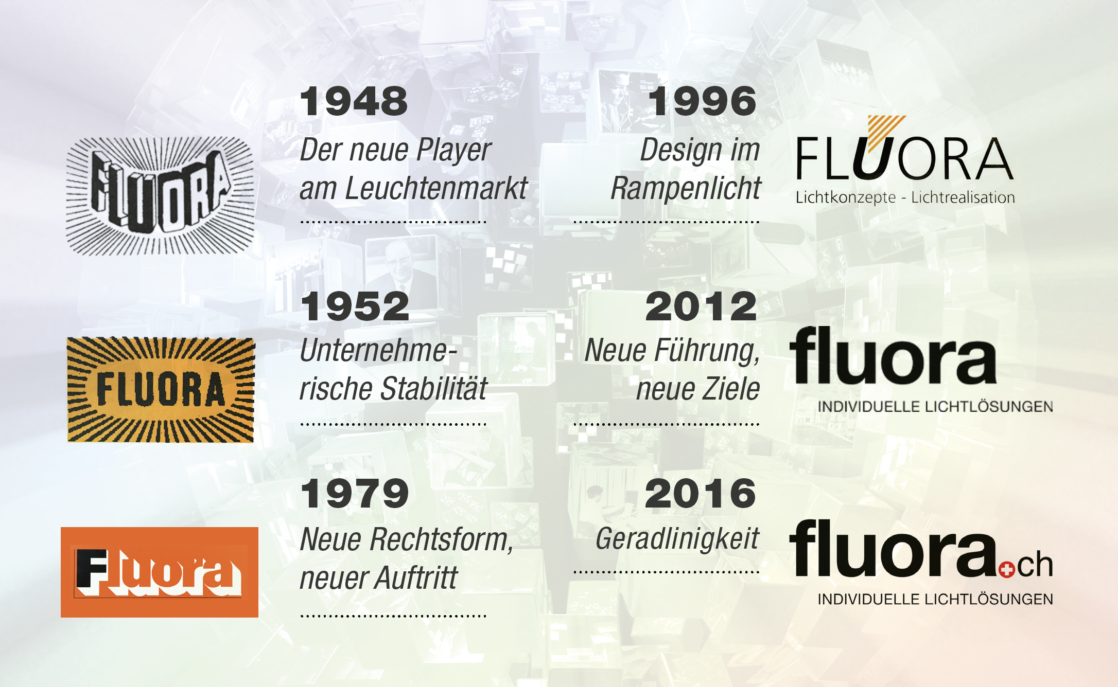 Fluora besteht und produziert seit nahezu 80 Jahren, davon etwa 72 Jahre in Herisau und seit rund 8 Jahren in Flawil. Die Fluora Leuchten Lichtmanufaktur AG mit motivierten und kompetenten Mitarbeitenden ist ein eigenständiges Unternehmen, das sein Handwerk versteht. Mit umfassendem Know-how begeistern wir unsere Kunden mit individuellen und nachhaltigen Lichtlösungen. Wir setzen Sehenswertes wirkungsvoll ins Licht.